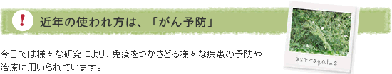 近年、「アストラガルス」は、欧米でガンに対する働きが注目されたのをきっかけに、 伝統的な使用方法に関連する有効性についての研究が多く進められています。