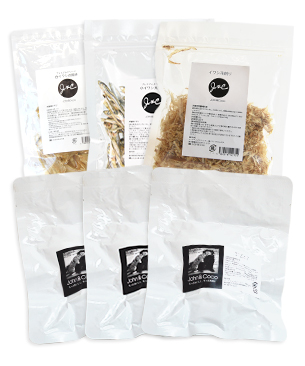 丸ごと食べられるおやつ2種にトッピングのふりかけ、手でほぐれるレトルト3袋が入っています。