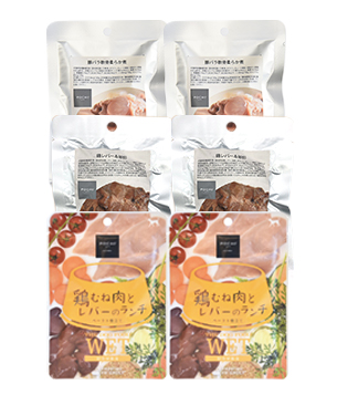 セット内容は、鉄分やビタミン豊富な鶏レバーと砂肝をレトルト加工した「鶏レバー&砂肝」、 コラーゲンやコンドロイチンを含むのでシニア犬にもオススメの「豚バラ軟骨柔らか煮」、 鶏のむね肉と栄養豊富で大好物な犬が多いレバーをベースにした総合栄養食ウェット「鶏むね肉とレバーのランチ」の3種類。