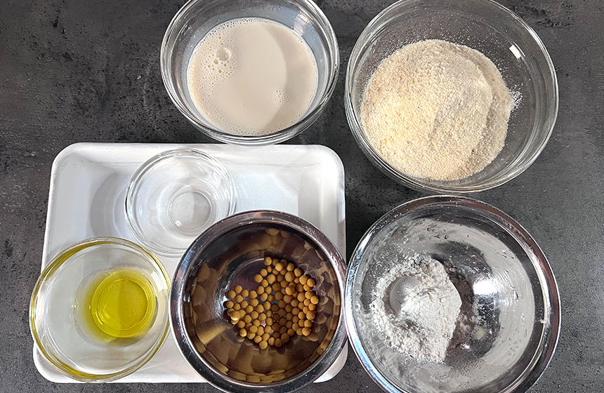 1.ボウルにおからパウダー、オリーブオイル、オリゴ糖、豆乳をいれ、手で混ぜ合わせる。