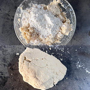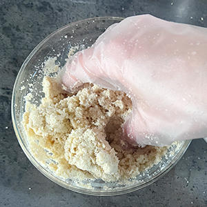 2. 1がまとまってきたら薄力粉をいれ、しっかり手でこねるように混ぜる。