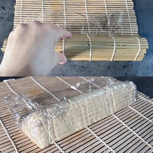3.まきすの上にラップをしき、2をのせ、三角になるようにぎゅっと力をいれて形を整える。そのまま冷蔵庫で1時間以上寝かせる。