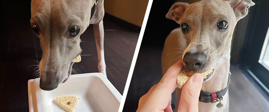クッキーやボーロなどサクサクっとしたお菓子が好きなうちの子。手作りおからクッキーも気に入ってくれるはず!まずはお皿にのせていただきます。チーズの風味とオリゴ糖の力で甘味もあってバクバク食べていました。手でもあげられるのでしつけにも良さそう。