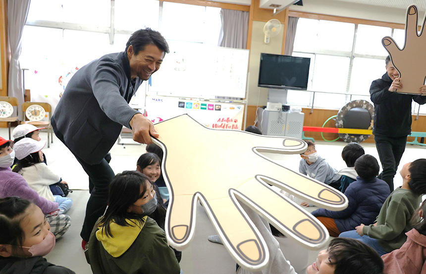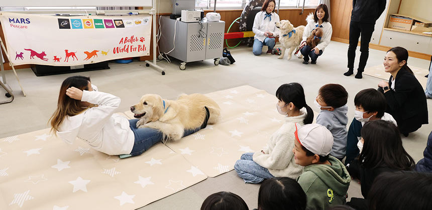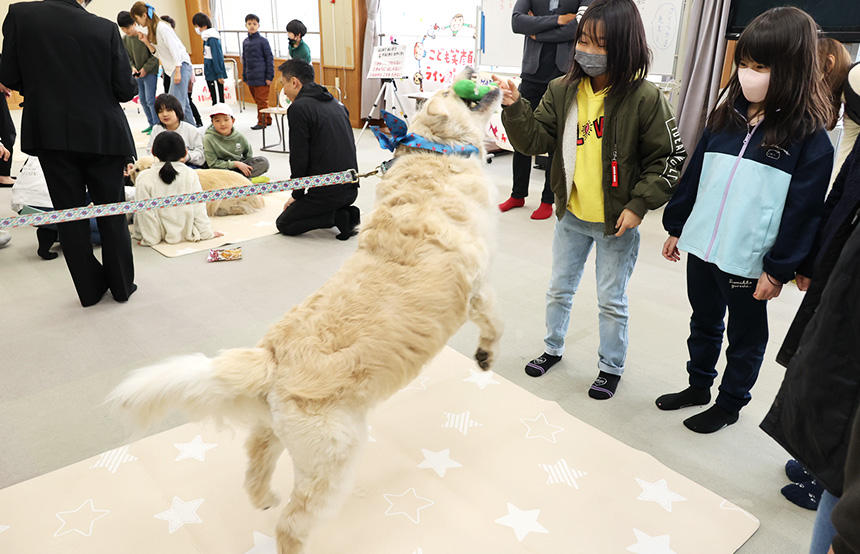 ポメラニアン、トイ・プードル、ゴールデン・レトリーバーなどが小学校のホールに入ってきた瞬間、子どもたちの歓声が上がります。