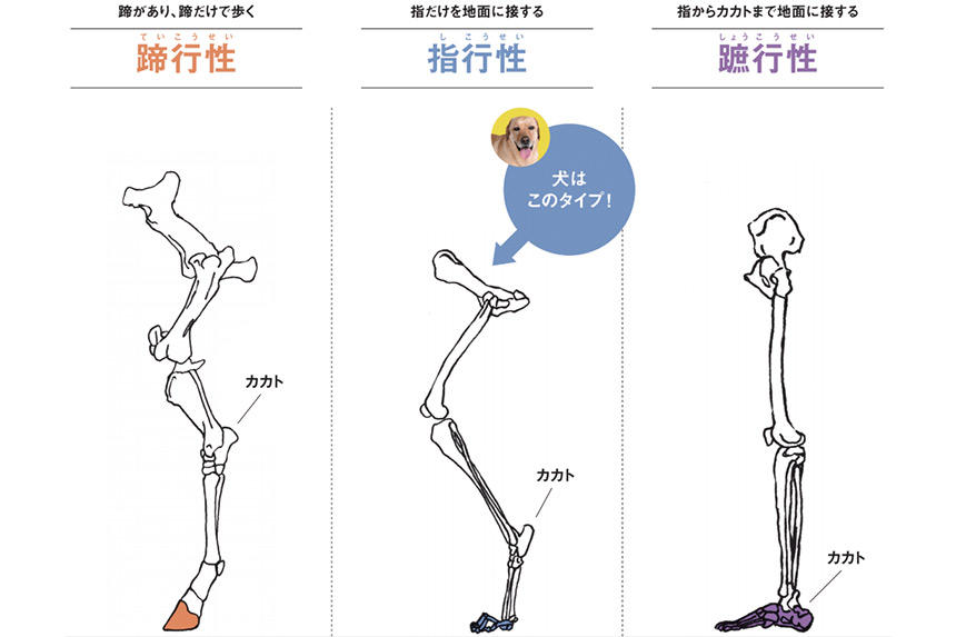 指のみを地面に着けて歩いたり走ったりするタイプ。犬はこれに該当します。