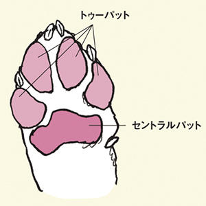 肉球の肉球は中央の大きなセントラルパット(Central Pat) と四つのトゥーパット(Toe Pat)から成り立ち、その肉球のつき方を利用して、上手に歩いたり走ったり、方向を変えたりしています。
