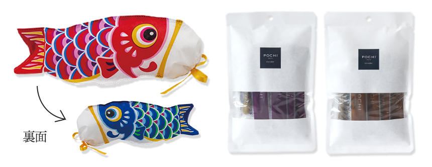 今回特別にご用意したのは、表と裏で赤と青の色違いが楽しめるこいのぼり袋が付いた特別セット。