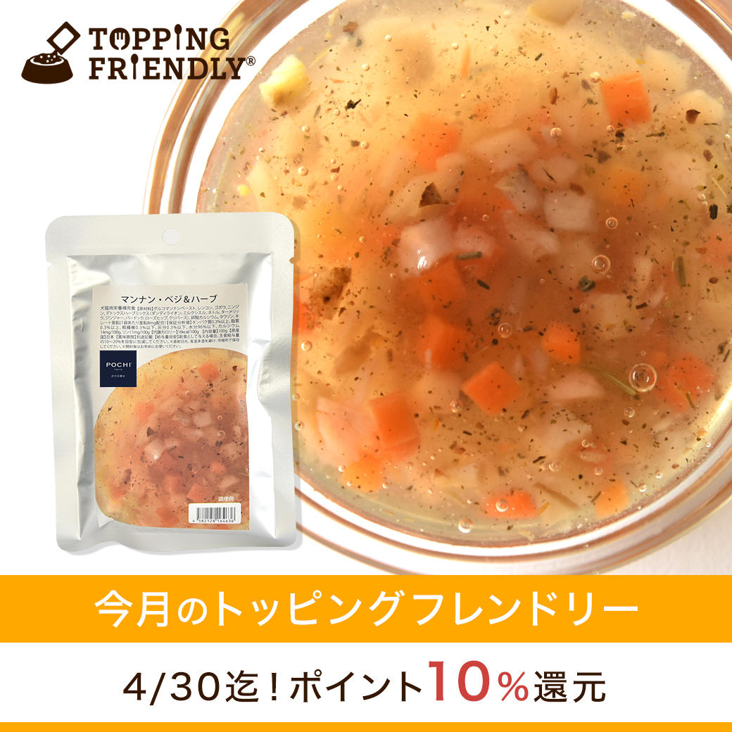 4月30日(水)までの期間限定で10%ポイント還元となります。 例えば「POCHI (ポチ) マンナン・ベジ&ハーブ 100g」を3袋購入なら105ポイント還元!