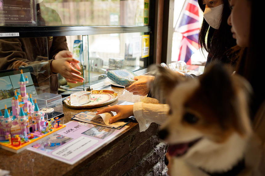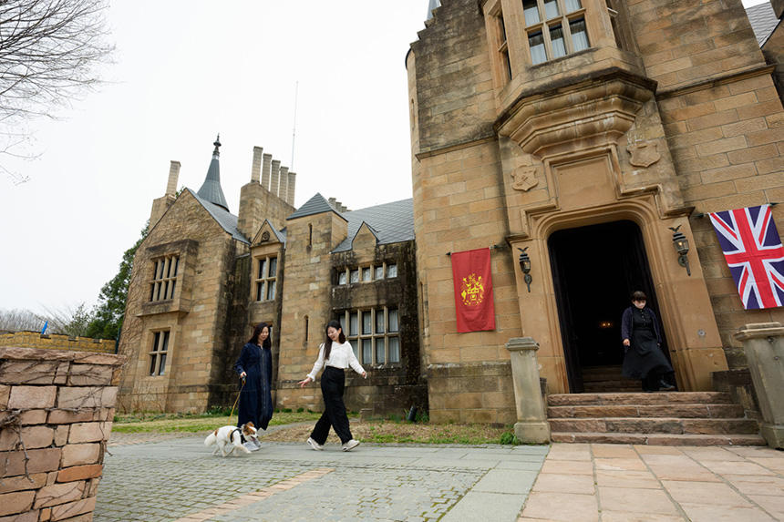 「ロックハート城」で一般来場者が見学できるのは、英国の調度品などの展示があるお城の中と本格的な英国風庭園、ショッピングエリアとレストランです。ほかに、結婚式場があり、お姫様・王子様風の衣装で場内を歩いたり写真撮影ができる「プリンセス体験」も人気です。今春のリニューアルでは、これらに加え、新たに広いドッグランスペースができました。また、レストランの一角にペットと一緒に利用できる室内席も設けられ、犬用のドレス体験コーナー(中世風のドレスのレンタル&撮影サービス)もできました。