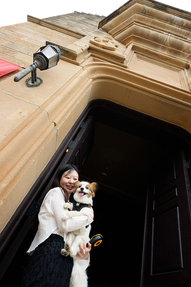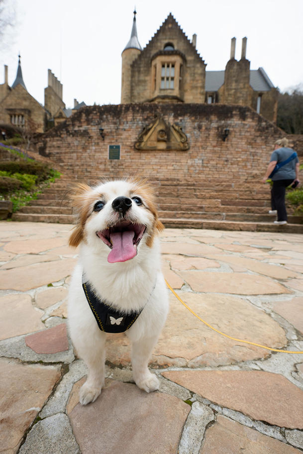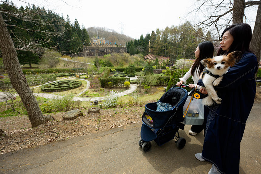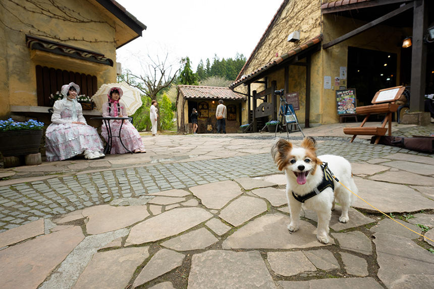 本場の“お城”を背景にしたコスプレ撮影や映画・ドラマのロケに人気の施設なのですが、私たち的に最も嬉しいのは、建物内を含めほとんどの場所にペットと一緒に入れることです。以前に一度先代犬の「マルコ」(ラブラドール・レトリーバー)と来たことがあるのですが、この春、さらにドッグフレンドリー度を強化してリニューアルオープンしたとのことで、再訪しました。今回は、パピヨンの「コロン」(14歳・メス)とご家族と一緒です。