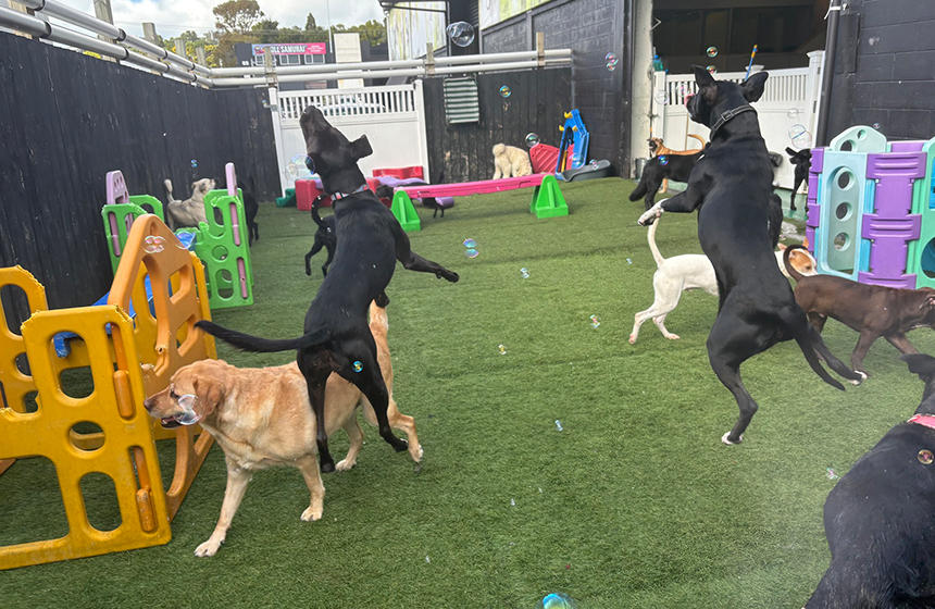 ペット・イン・ザ・シティには屋内外に広い運動スペースがあり、天候に関係なく犬たちがたっぷり遊べるようデザインされています。犬のサイズや性格によって遊ぶエリアが分けられているのも特徴。ニュージーランドの犬たち、特にオークランドの犬たちはほかの犬たちと仲良くしたがる「犬好き」の傾向が見られますが、犬種や個体差もあり、一人遊びが好きな子や、静かにするのを好む子もいます。犬同士の相性もあるので、そうした違いを見極め、トラブルが起きないよう配慮しているのです。