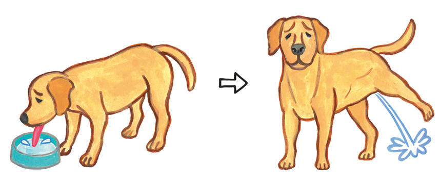 オシッコについて、まずは水分の内訳を理解しておきましょう。オシッコとして排泄される水分は、不可避尿(体内の老廃物)と随意尿(摂取した食べ物や水分の量に応じて調整)の二つに分かれます。人間の場合は、一日に約500mlの不可避尿と900mlの随意尿を排出されるといわれています。犬の場合、目安として1時間につき体重1kgあたり1〜2mlの尿を排出したほうがいいとされています(例:体重30kgの大型犬の場合、1時間に30ml以上)。