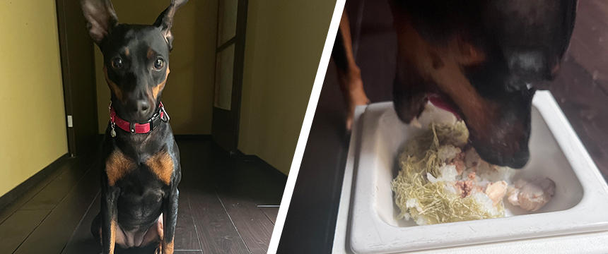 どんな味がするのか気になって耳がピーンと立ってしまううちの子。食べる前から楽しみだね。大きな口を開けてガブリ。豪快な食べ方で思わず笑ってしまいました。外はささみととろろ昆布が、中にはレバーパテが入っているのでおいしさも2倍です!きっとお外で食べたらもっとおいしいよね。どこに行こうかお出かけ計画を立てるのが楽しみになってきました。