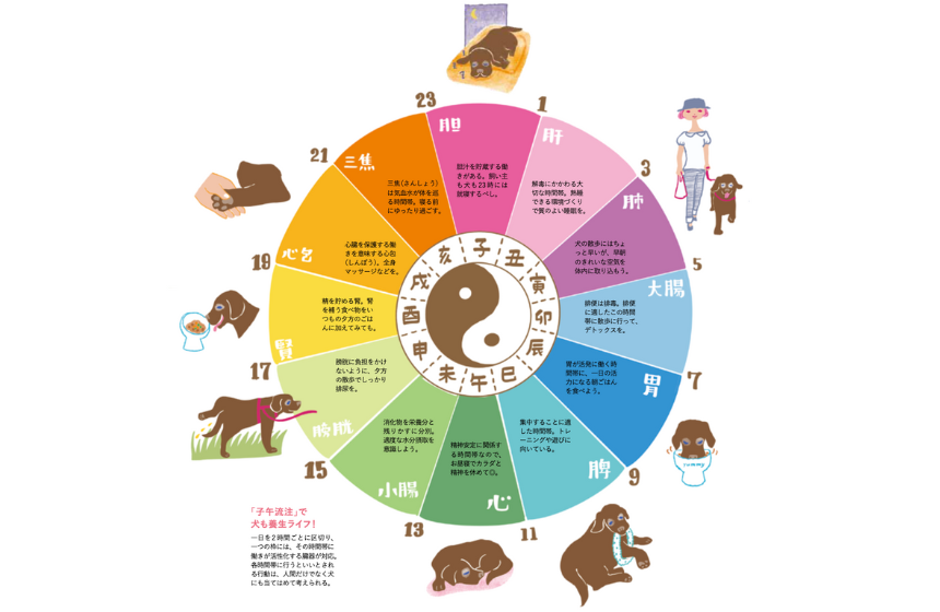 東洋医学には人間の「内臓活動時間」を示した 「子午流注(しごるうちゅう)」というものがあります。一日を2時間ごとに区切り、一つの枠には、その時間帯に働きが活性化する臓器が対応します。各時間帯に行うといいとされる行動は、人間だけでなく犬にも当てはめて考えることができます。
