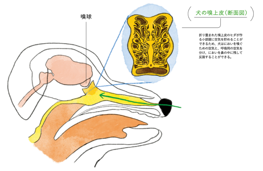 「人間も犬も哺乳類なので、基本的な構造は同じですよ」と言うのは、嗅覚やフェロモンに関する遺伝子の研究を行う新村芳人先生。「空気中を漂っているにおい分子が鼻の中に入り、嗅上皮(きゅうじょうひ)という場所で捉えられます。嗅上皮にはにおいを受け取る嗅神経細胞が集まっていて、嗅毛(きゅうもう)と呼ばれる毛が生えています。その先にはにおいセンサーであるさまざまな受容体があり、それぞれ結合する分子が決まっています。その信号が嗅神経を通じて“においの脳”である嗅球(きゅうきゅう)に伝わり、認識されるという流れです。これはどんな哺乳類でも同じなのです。ただ、人と犬の鼻の違いのポイントは、“嗅上皮の大きさ”、“におい受容体の種類の数”、“鼻の外側の構造”です。犬は人の30倍の大きさの嗅上皮を持っていて、受容体の種類は約2倍。さらに、人にはない鼻鏡という鼻先の構造が、空気を効率よく取り込むのを助けるため、犬は人よりもはるかに嗅覚が優れているのです」。