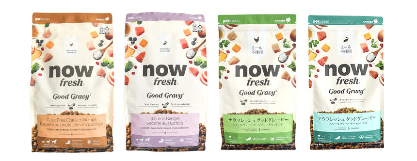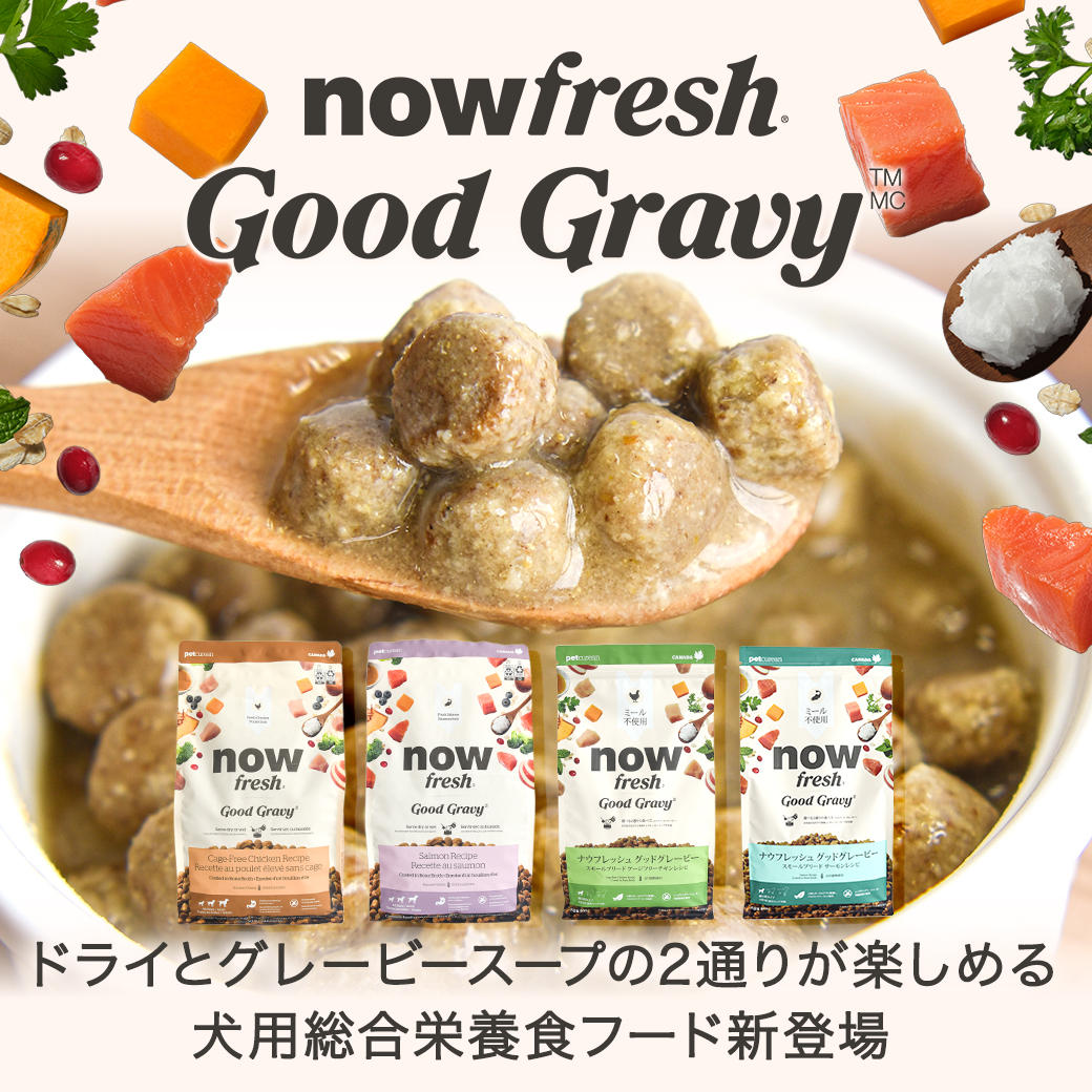 「フレッシュ(新鮮さ)」にトコトンこだわり、おいしさが評判のドッグフード「ナウフレッシュ」より、ドライとグレービースープの2通りが楽しめるグッドグレービーシリーズが新登場。