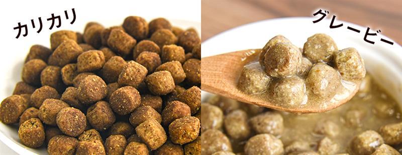 新登場となったグッドグレービーシリーズは、粒の周りをターキーボーンスープでコーティングすることで、ドライとグレービースープ2通りの食べ方が可能な成犬用の総合栄養食です。