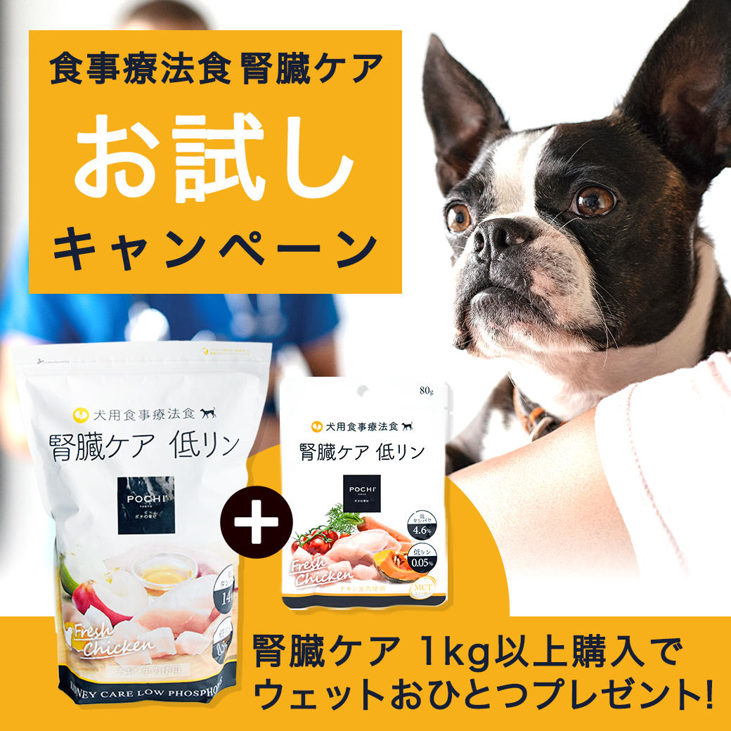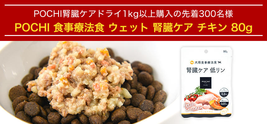 今回お試しキャンペーンとしてドライフード1kg以上購入者を対象に、「POCHI 食事療法食 ウェット 腎臓ケア チキン」をプレゼント。