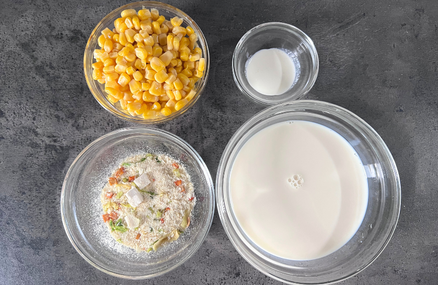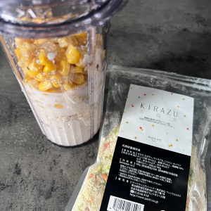 1.ミキサーに汁切りしたコーン缶、POCHI キラズ、豆乳をいれ、コーンが細かくなるまで攪拌する。