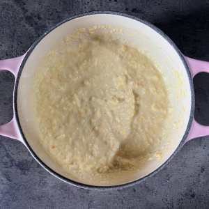 今回は、食べごたえが出るよう少し粒感を楽しめる仕立てになっているので、ザルなどで濾さず、そのまま温めて召し上がってください。