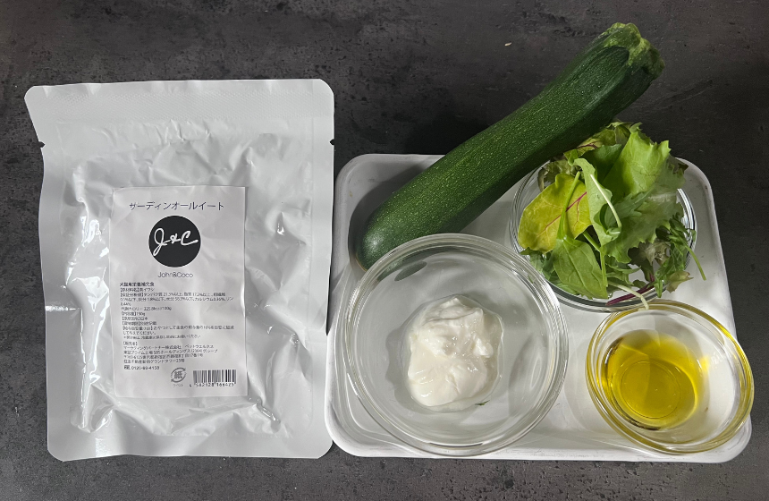 3回目のメニューは、ズッキーニのステーキのイワシソース添えです。素材の味を活かしたシンプルなステーキを、内臓を取り除いたイワシを丸ごと味わえるレトルトを使うアレンジソースで、栄養面も満点な夏のごちそうです。