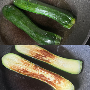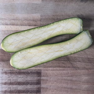 1.ズッキーニを縦半分に切り、格子状に切り目を入れる。