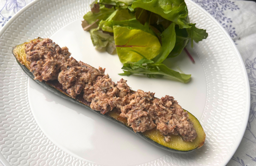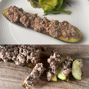 ズッキーニの約95%は水分で低カロリーであり、体を冷やす効果を持っているので夏バテ予防にぴったりの食材。切れ目をいれてしっかり蒸し焼きにすることで、柔らかく食べやすく仕上げました。ヨーグルトをまぜたイワシのソースは、レトルトを利用するのでとても簡単。残ったものはそのままあげても、いつものフードにトッピングしてもいいですね。