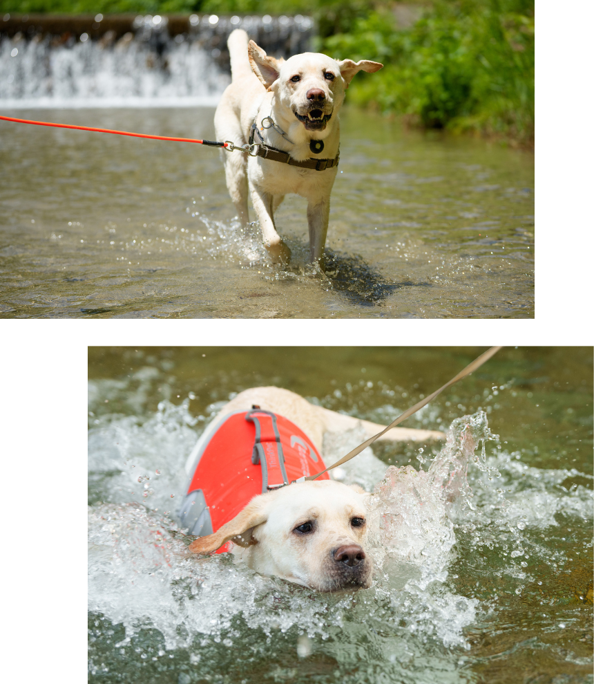 また、アイメイトには、「利口な不服従」と呼ばれる重要かつ高度な訓練があります。アイメイト歩行は基本的に、使用者の「ゴー(進め)」「コーナー(交差点の段差などで止まれ)」「ライト(右へ進め)」などの指示に従って歩きます。しかし、急な車の飛び出しなどの危険を察知した場合には、指示があっても従わずに止まったり回避したりする自主性も求められます。その影響だと思いますが、現役に限らず、リタイア犬などアイメイト関係の犬には、「危険な場所」の一つである川、水路、水たまりなどには自ら入ろうとしない強い意志を感じることが多いです。