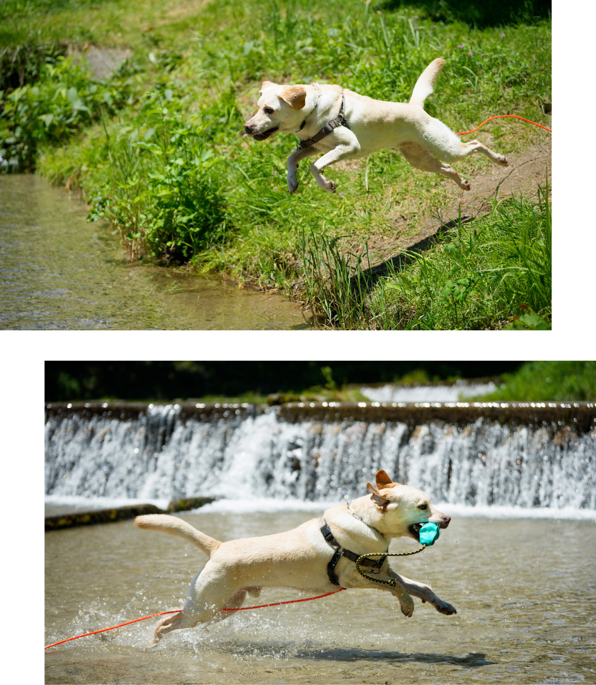 ルカも来た当初はそうでしたが、家庭犬として過ごすうちに、ボール遊びに目覚めました。そして、おもちゃを使って誘導するなどして「浅いところなら怖くないよ」と教えると、やがて水たまりから始まって、足がつく川にも自分から楽しそうに入っていくようになりました。足がつかない深いところにも積極的には飛び込みませんが、入ってしまえば上手に泳ぎます。そうして遊んでいる姿は、一般の飼い主としては微笑ましいもの。家庭犬としての適性を開花させたルカのそんな姿が、我が家の夏を幸せにします。