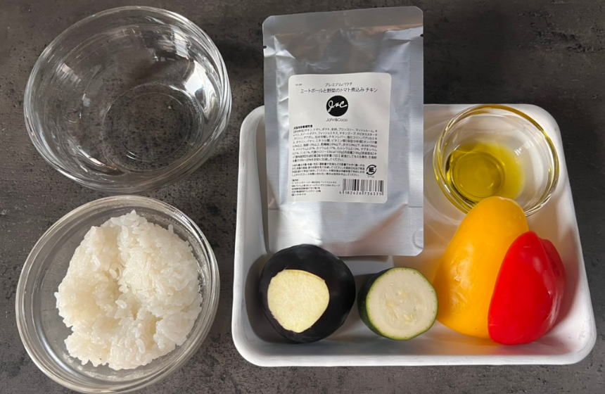 1回目のメニューは、夏野菜の冷製ラタトゥイユ・リゾット。レトルトに夏野菜をプラスするだけでできる、見た目もオシャレな簡単レシピです。ごろっとしたチキンのミートボールと6種類の野菜をトマトスープで煮込んだ、J&C プレミアムパウチ ミートボールと野菜のトマト煮込み チキンに、夏野菜のズッキーニやパプリカなどを加えてラタトゥイユを作ります。さらにごはんを入れて冷蔵庫で冷やすことで、夏にぴったりのごはんに仕上げました。