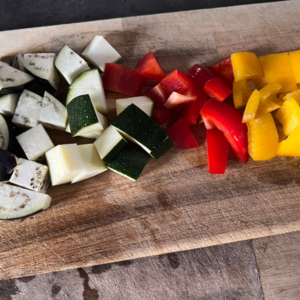 1.ズッキーニ、なす、パプリカ(赤)、パプリカ(黄)は食べやすいように2cm程度の大きさに切っておく。