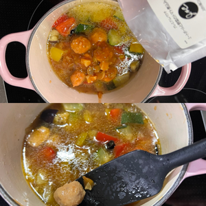 3.②にJ&C プレミアムパウチ ミートボールと野菜のトマト煮込み チキン、水を入れ、3分ほど煮る。ミートボールは野菜と同じ大きさになるようにスプーンなどを使って潰して小さくする。