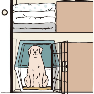 犬が心配になりますが、飼い主はまず自分の身を守ることに専念します。自宅には普段から犬の安全な居場所を用意し、何かあったらそこに逃げ込めるようにしておきます。同時に、それらの居場所が犬にとって心地よく安心できる場所であるようトレーニングしておくことも重要です。クレートを用意する場合は、閉じ込める形にならないように気をつけましょう。
