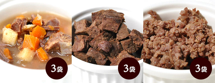 牛や豚などの肉と比べても高タンパク、低脂肪、低カロリーで栄養価が高い鹿肉の中から、 ミンチ・ポトフ・ダイスカット3種の鹿肉レトルトを詰め合わせました。