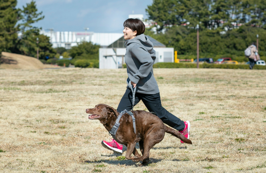 健康づくりや運動前後のウォーミングアップ・クールダウンとして、人と話す余裕があるくらいのペースで走るのがジョギングです。体への負荷は低強度で、時間の目安にして20分以上走り続けることで効果が出てきます。長時間継続して行う有酸素運動は、心臓や肺の機能が強化され、血液循環や代謝向上にも役立つとされています。そしてダッシュは、短い時間で高強度の負荷を体にかける酸素運動で、筋力トレーニングと同質の効果を得ることができます。これらを犬の散歩に取り入れる際、特に注意したいのがダッシュです。人につられて犬のテンションが上がり、走れば犬のほうが速く、転倒などの危険もあるので、犬のヒールポジションがしっかりできていることが必須です。