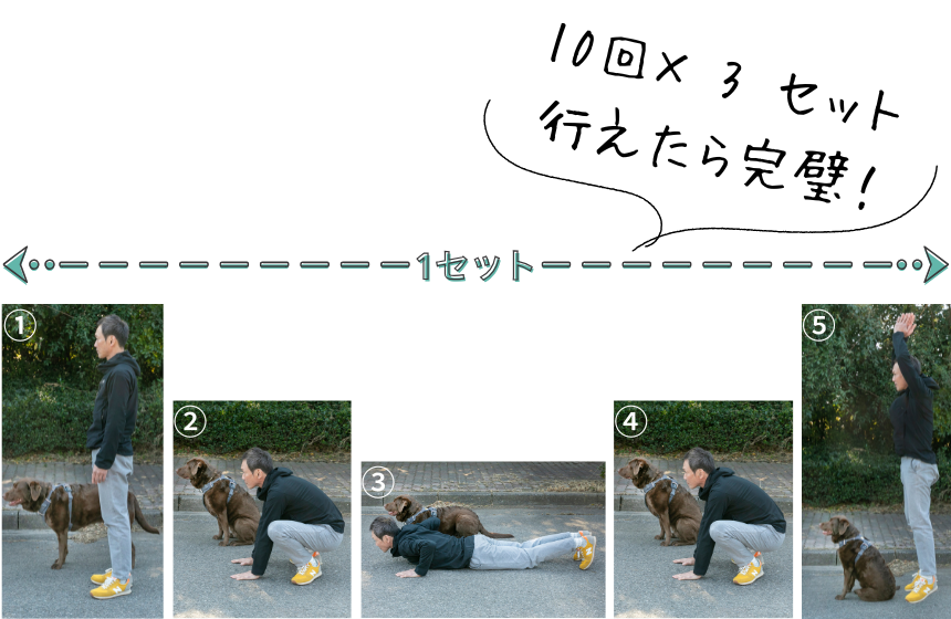 立った状態から腕立て伏せの姿勢になり、立ち上がる流れでジャンプするという、全身を使った運動方法が「バーピー」です。筋力を鍛えることにもなりますが、実際には、脊髄反射の一つである筋肉の伸張反射という働きを使って瞬発力を向上させ、プライオメトリクストレーニング的効果が高いです。やってみると実感しますが、これでもかと重力に反する動きをするだけに、とにかくハードです。ただその分、短時間で効率的に脂肪燃焼できる他、体力の向上にもてきめん。また場所を取らず、トレーニング道具も必要なく、自宅でも、もちろん散歩先でもできるという取り組みの手軽さもあります。その際、犬と一緒にアップ、オスワリ、フセの「ポーズ」で一緒にやってくれたら、何よりのモチベーションになるでしょう。