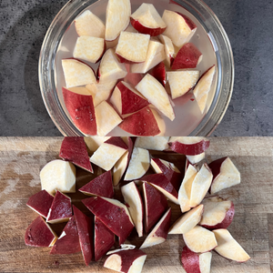 1.さつまいもは一口サイズの乱切りにする。水にさらしてアクを取ったら水気を切っておく。