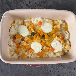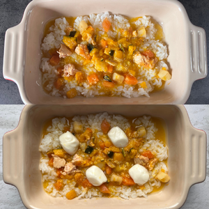 2.耐熱皿にごはんをしき、POCHI鶏肉とかぼちゃのポタージュをかけ、①のモッツアレラチーズを間隔をあけてのせる。