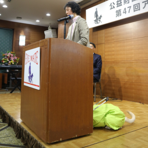 続いて、「アイメイトを語る」と題し、支援企業・団体の代表者3名、ならびに使用者の中から代表して1名、そして協会職員1名より、それぞれの視点からアイメイトへの想いが語られ、企業・団体の代表者からは、支援に至った経緯や社内での周知に対する取り組みを中心に、使用者からは、今のアイメイト(盲導犬)との実際の歩行時のエピソードと想いが、協会職員からは仕事への熱意や支援者への感謝などが話されました。