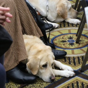 また、アイメイト・デーの開始時刻まで会場を歩いていると、続々とアイメイト(盲導犬)と使用者が到着。やや長時間の滞在となるため、会場所定の場所で「ワン・ツー、ワン・ツー」という使用者の合図をもとに、アイメイト(盲導犬)が用を足す様子が見られました。