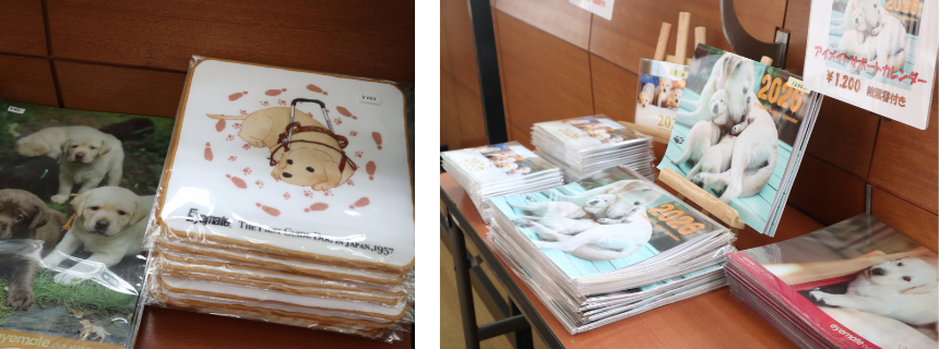 ほかにも、絵を描くことが好きなアイメイト協会職員作のイラストが描かれたハンカチや、POCHI内コラムで連載中の「Dog Snapshot R 令和の犬景」の執筆を務める内村コースケさん撮影の、アイメイト(盲導犬)の犬種であるラブラドールの写真が大々的にプリントされたカレンダー、 編み物キーホルダーなど、可愛らしいグッズが多く陳列されていました。