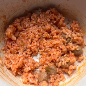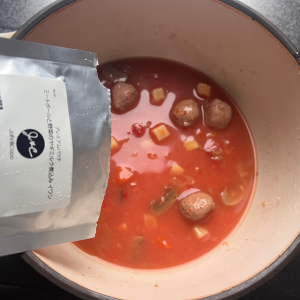 2.炊飯器に①の米、J&C プレミアムパウチ ミートボールと野菜のヤギミルク煮込み イワシ 100g、トマトペースト、水を入れ、よく混ぜたら炊く。