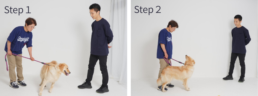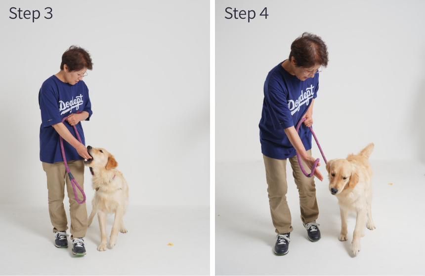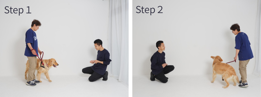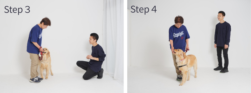 Step4:飛びつかず落ち着くことができたら、ごほうびをあげましょう。そのまま対象者から離れ、1~4を繰り返すことで、犬自身が興奮をコントロールし、飛びつく前に冷静になるクセをつけることができます。