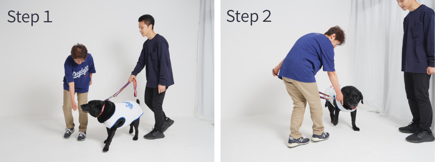 Step1:散歩の途中、動かなくなったりした時は、あらかじめサイン決め、それをきっかけに誘導します。
