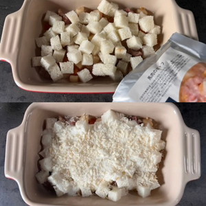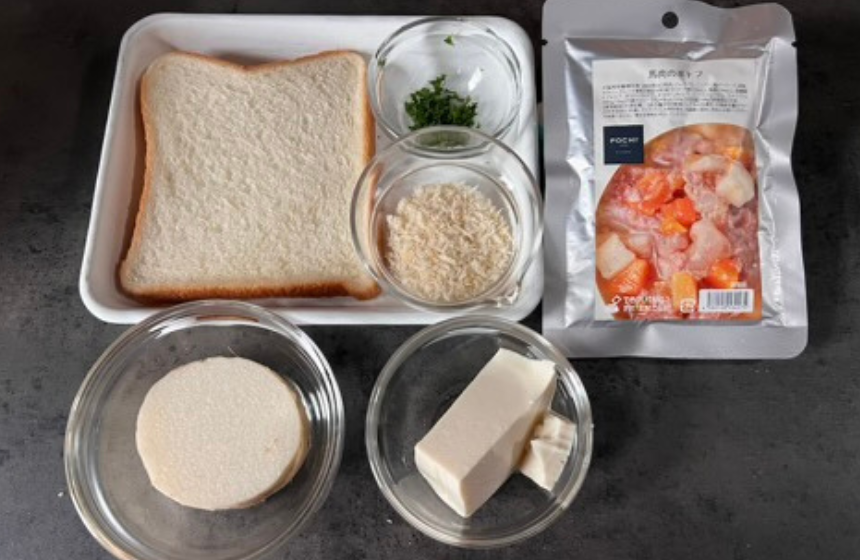 3.グラタン皿にPOCHI 馬肉のポトフを入れ、食パンをのせる。②のソースをかけ、パン粉をちらして予熱した200度のオーブンで10分焼く。