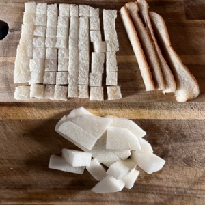 1.食パンは耳をとり、1cm角くらいの大きさにカットしておく。長芋は皮をむいて、小さく切っておく。