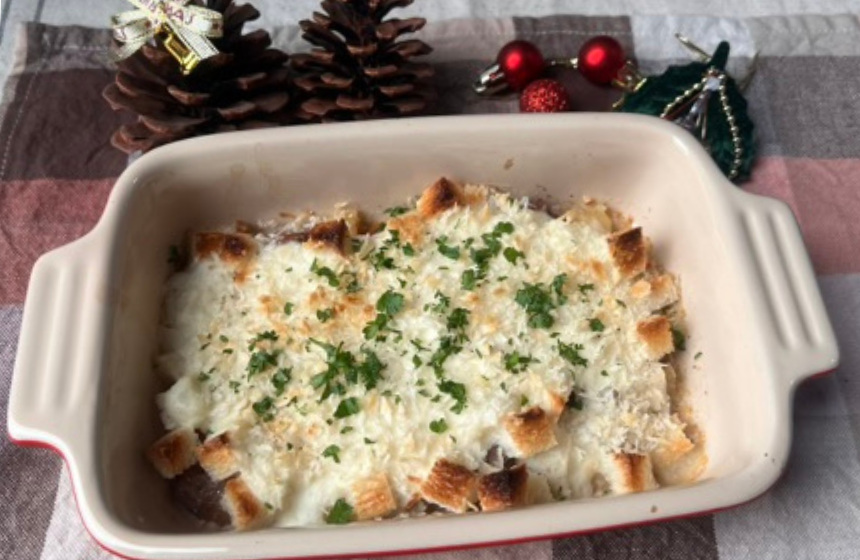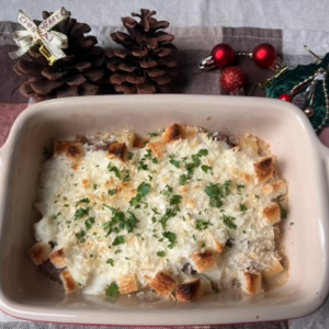 馬肉や野菜のうまみがたっぷり溶け込んだスープに食パンを染み込ませて作ります。長時間かけてじっくり煮込む必要のあるポトフも、レトルトのPOCHI 馬肉のポトフを使えばお手軽。そして、チーズの代わりに長芋と豆腐を使って、簡単にヘルシーホワイトソースのできあがり。ぜひ今年のクリスマスに作ってみてください。