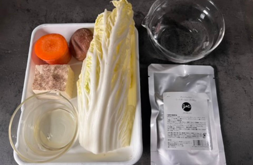 4.③に水、J&C プレミアムパウチ ミートボールスープ チキン 60g、②の白菜と人参、①の焼き豆腐を入れ、煮立てる。