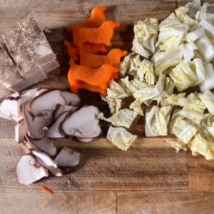 1.焼き豆腐は12等分にカットし、白菜は、2cm角くらいの大きさにカット、椎茸は半分にカットして薄切り、人参は6等分に輪切りにしたあと型を使ってくり抜く(小さくスライスにしてもOK)。