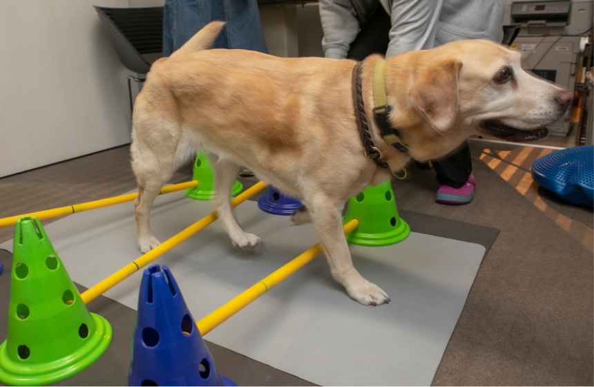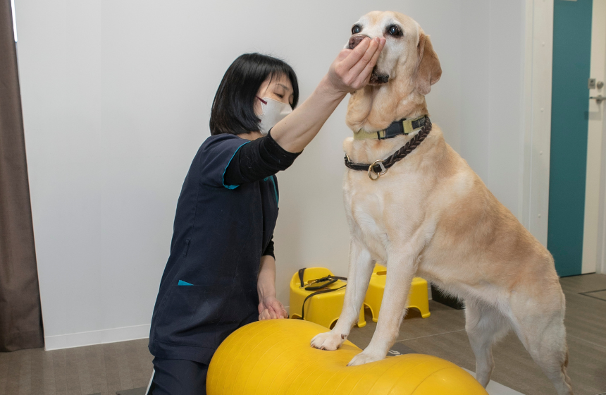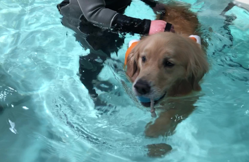 水の浮力などの特性を利用して、プールや水中トレッドミルで行う理学療法です。水の浮力によって筋肉やヒザに負荷がかかりにくく、動かしやすくなります。理学療法分野を専門とする獣医師が考えたプログラムでトレーニングを実施します。水中トレッドミルは術後3週間から、プールは術後約6週間から利用可能です。